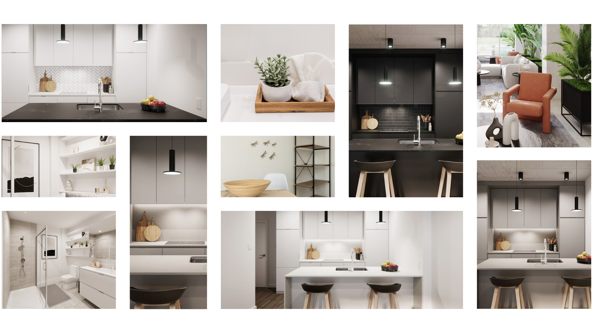 - Les luminaires, tabourets et autres accessoires présents dans ces rendus sont à titre suggestifs seulement et ne sont pas inclus dans votre unité.